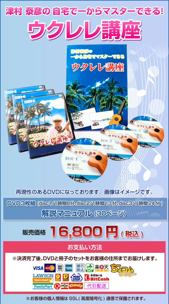 今回の津村先生のDVDではウクレレを「本格的な弦楽器として演奏する第一歩」、といえる内容になっています。このDVDを傍らに練習すれば、「ウクレレのイメージが変わった」「ウクレレでこんなことができるの!?」という驚きの声を将来たくさんいただくことができるでしょう。