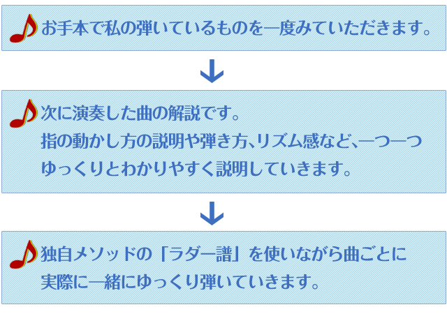 レッスンに使われている楽譜は「ラダー譜」と呼ばれ、楽譜が読めない方にも直感的に押さえる場所、運指がわかる優れものです。楽譜に苦手意識のある方も問題なく練習していけるでしょう。特に独学で練習している方は指摘してくれる先生がいませんので、ラダー譜で確実に運指をチェックできることは上達の近道といえます。